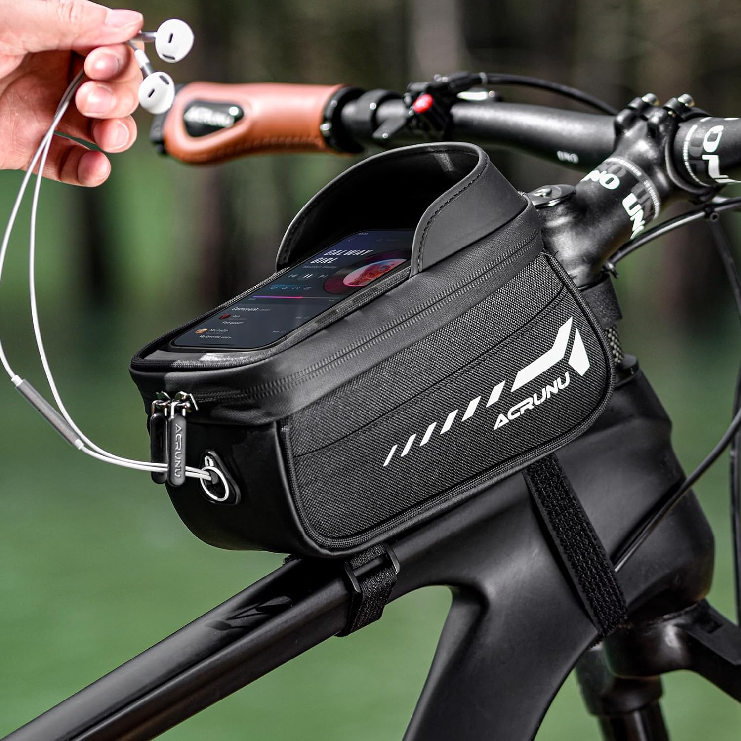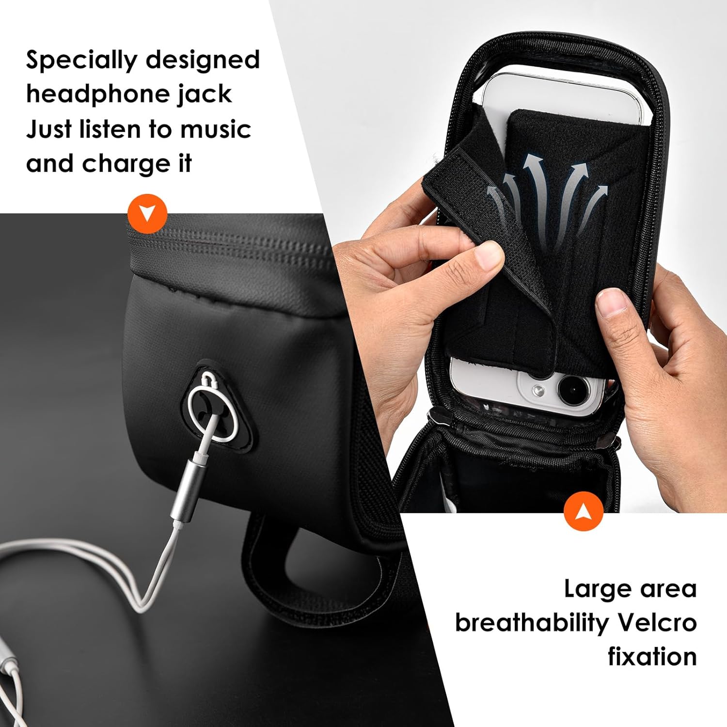 - HUMANIZATION DESIGN: The bike phone mount bag has many humanization designs. A, The hidden earphone hole allows you to answer the phone or enjoy music freely while cycling. B, Breathable double-sided velcro secures the phone to prevent phone overheating. C, dual soft rubber zipper pulls make it convenient to open & close