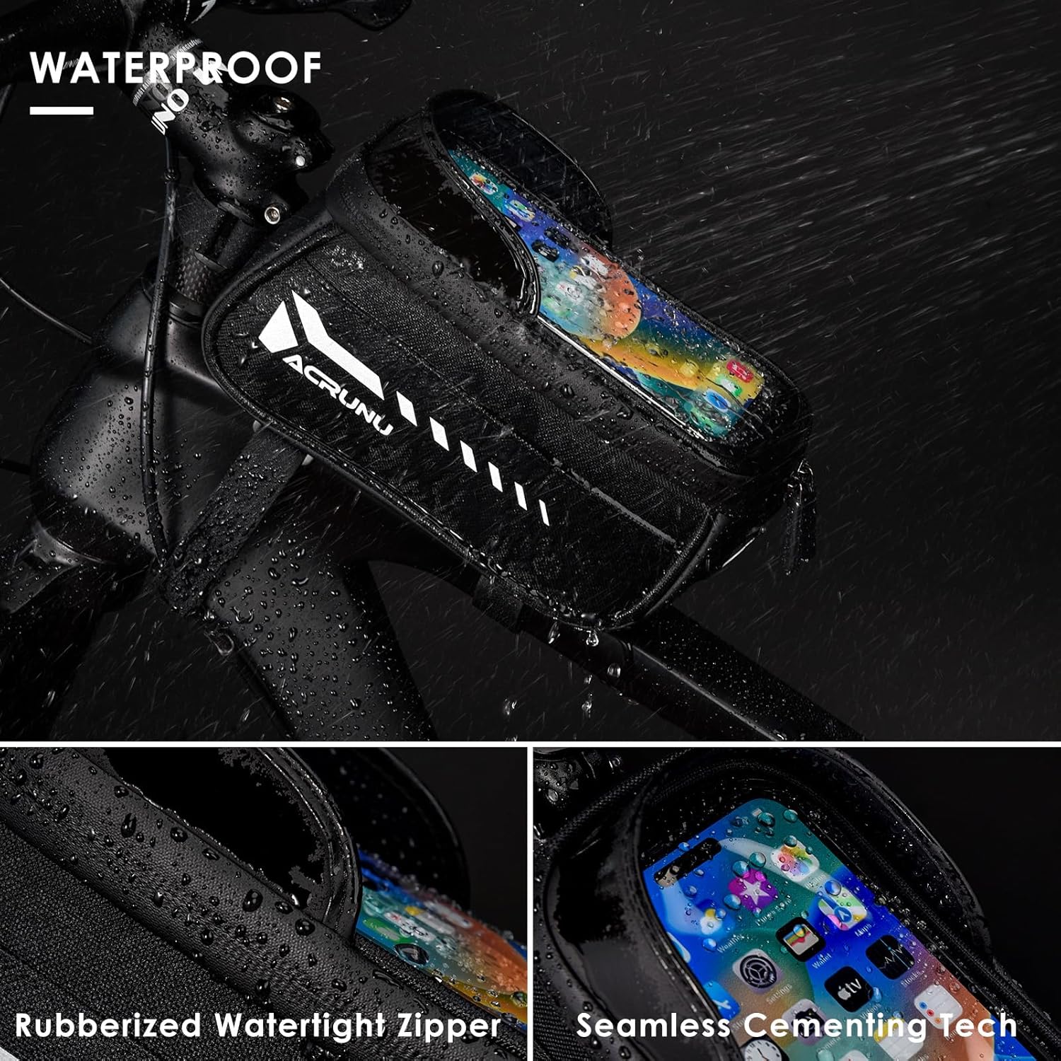 - TPU WATERPROOF MATERIAL:The bike top tube bag is made of TPU waterproof hard shell and TPU waterproof film design with sealed double zippers closure. ensuring that the no fear of getting your phone or bag items wet when it rains. The sun visor and flashing board are great to use for a rainy or sunny day