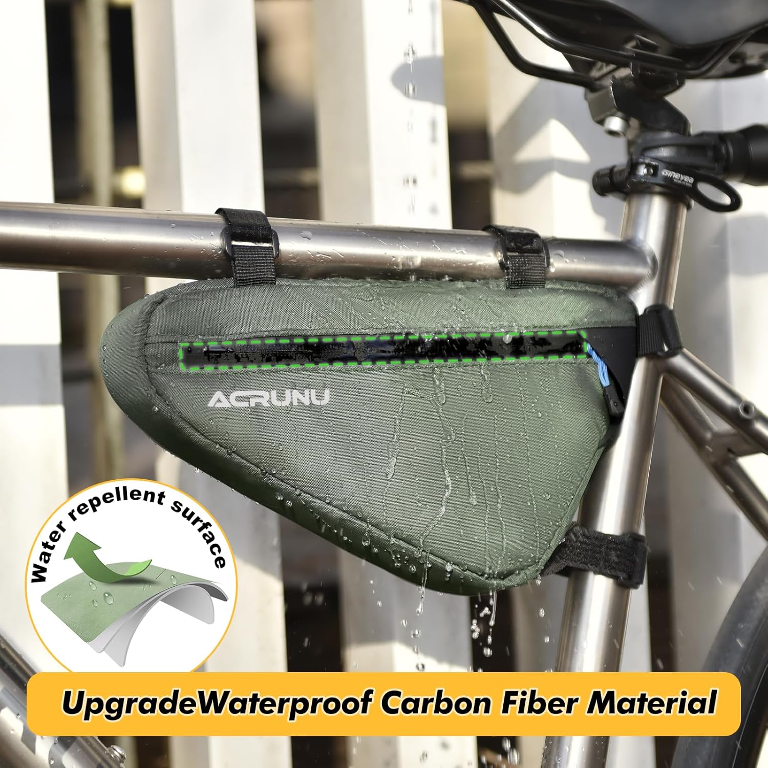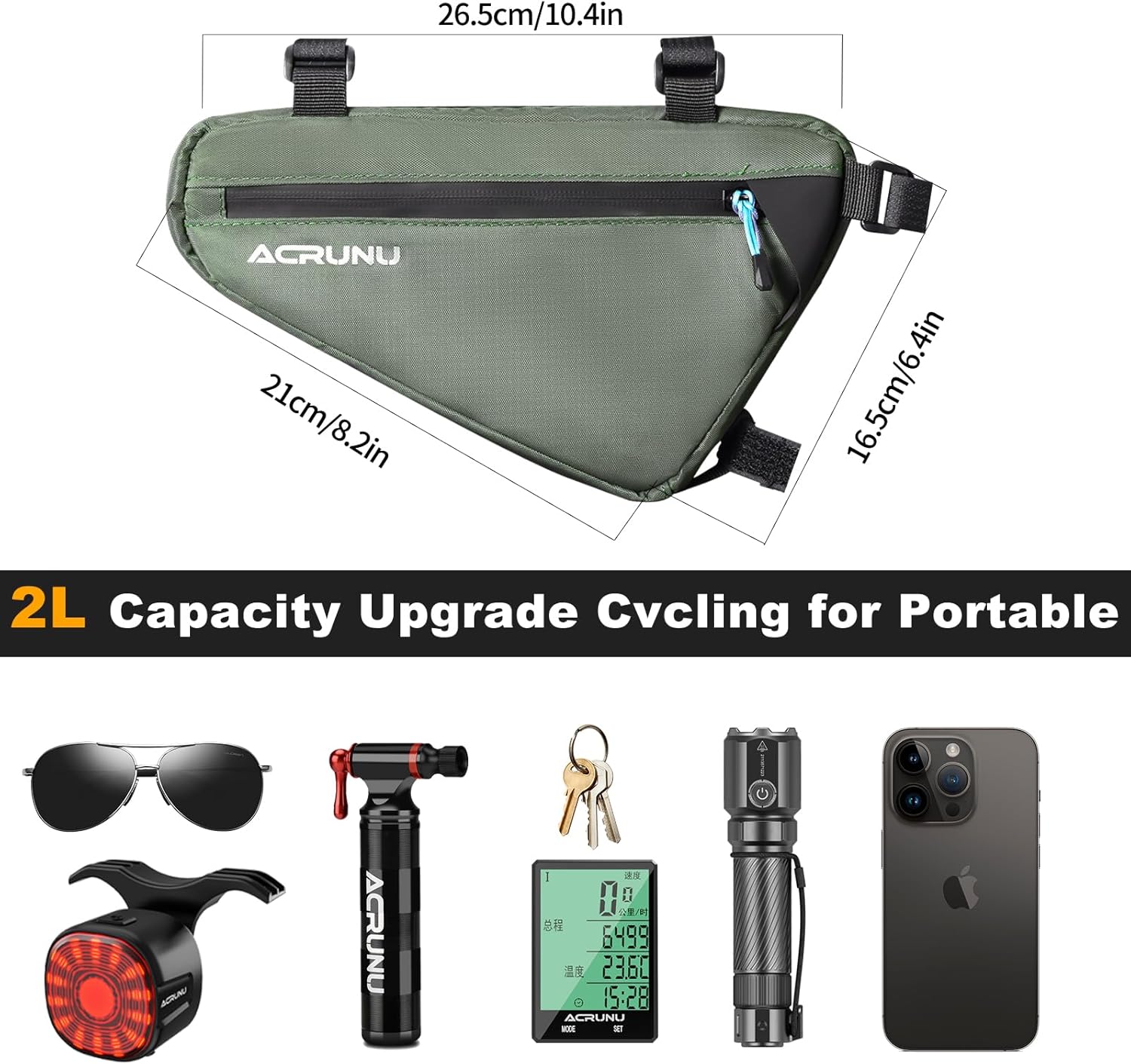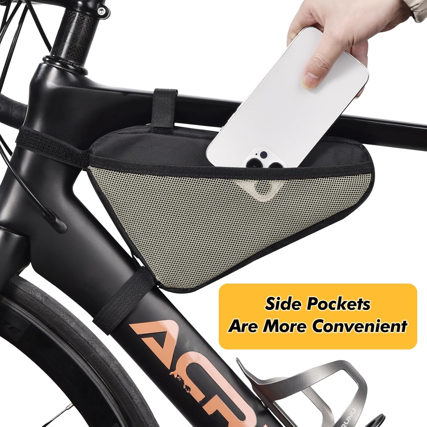 • Strong Stability : Uniquely designed loops all around the bag frame, bike bags for bicycles plus 3 independent hook and loop fastener straps, the bike triangle bag can be installed securely and firmly under the seat or near the handlebar, with almost no shaking, to not get in the way of the water bottle bracket