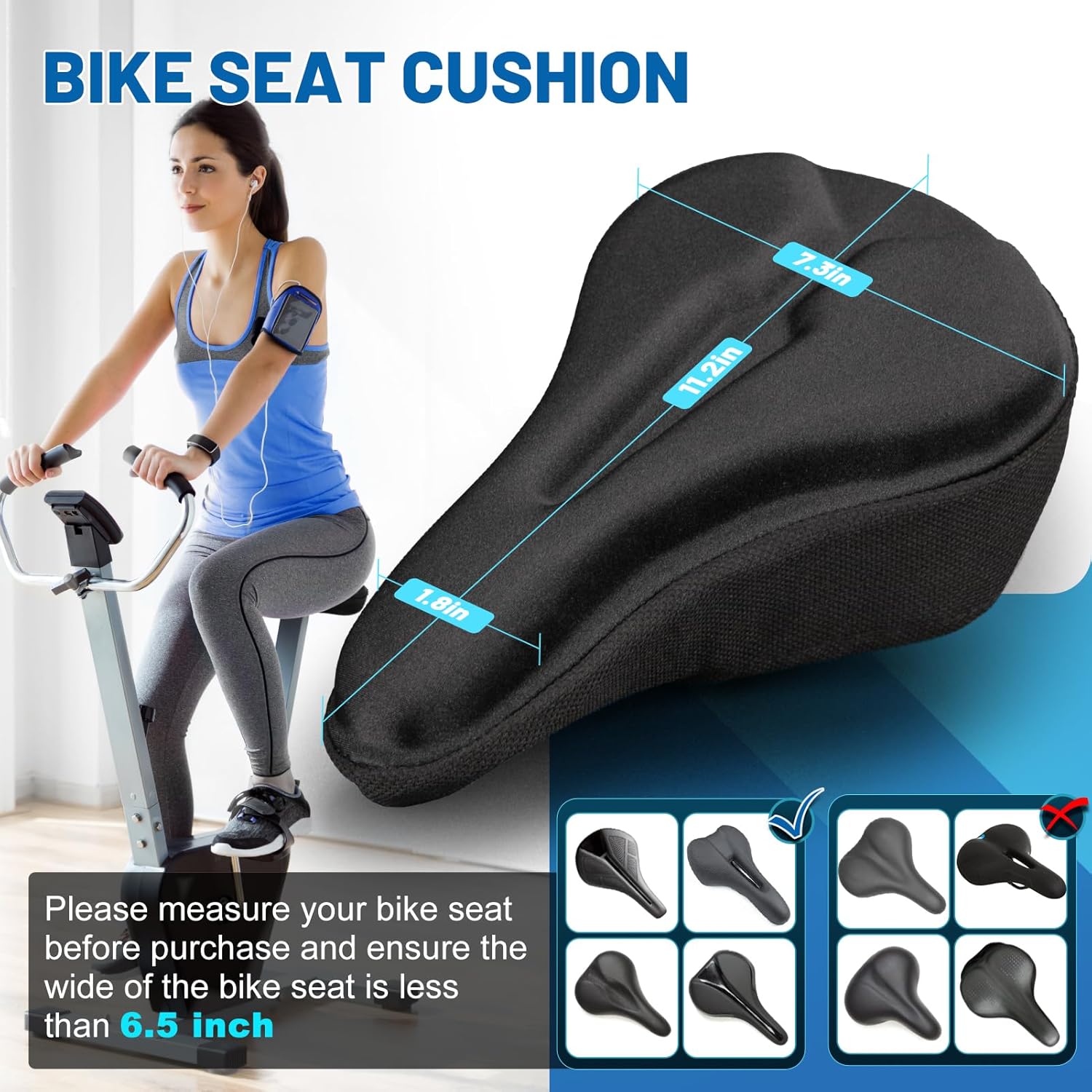 Compatibility: The padded bicycle seat cushion not only fits for indoor stationary cycling spinning bike, but also for outdoor mountain / road / city / trekking bikes. Note: Please measure your bike seat before purchase and ensure the wide of the seat is less than 6.5 inch