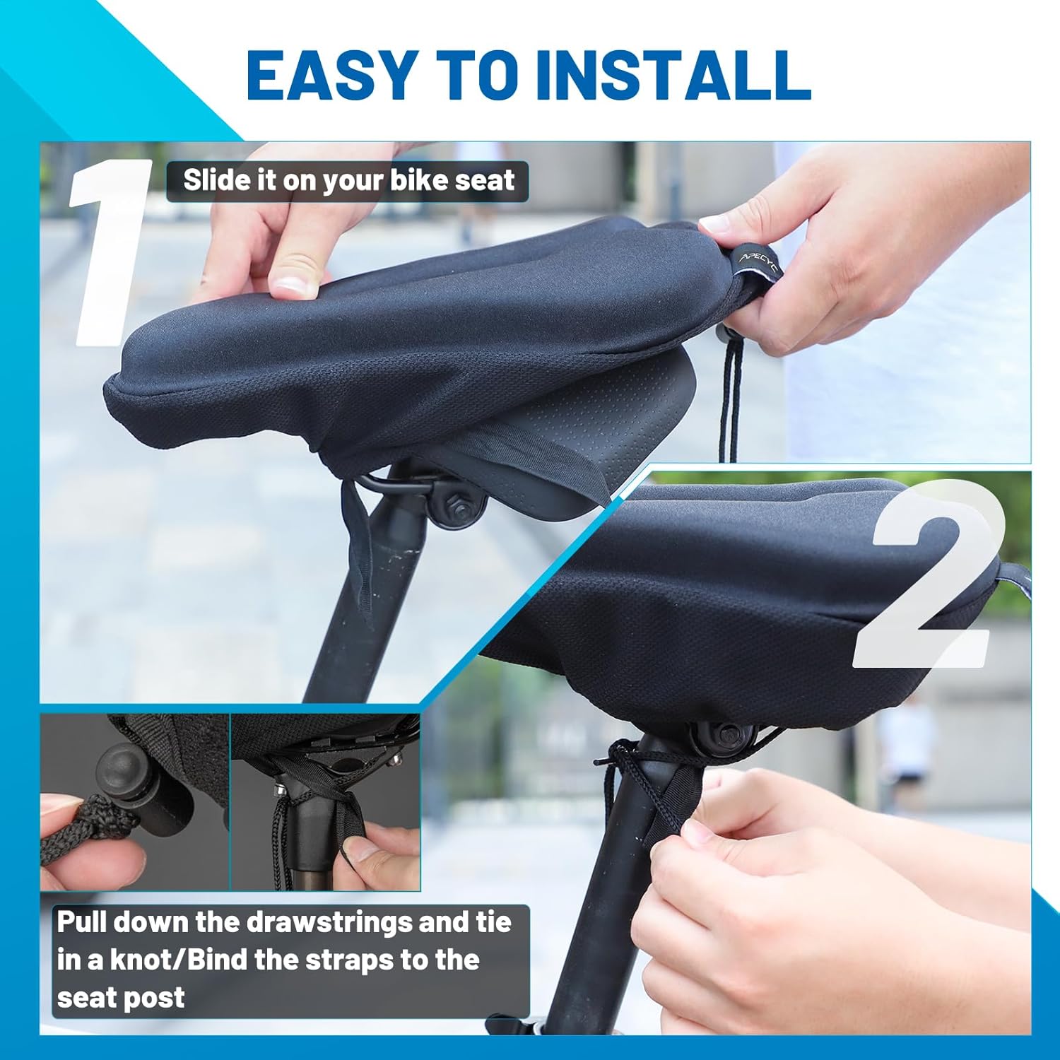 Premium Gel Padding: APECYC bicycle seat cushion offers more soft and thicker gel padding for adding more comfort and extra cushion, reducing pressure on sensitive areas and allowing you to ride or workout for longer periods without discomfort
