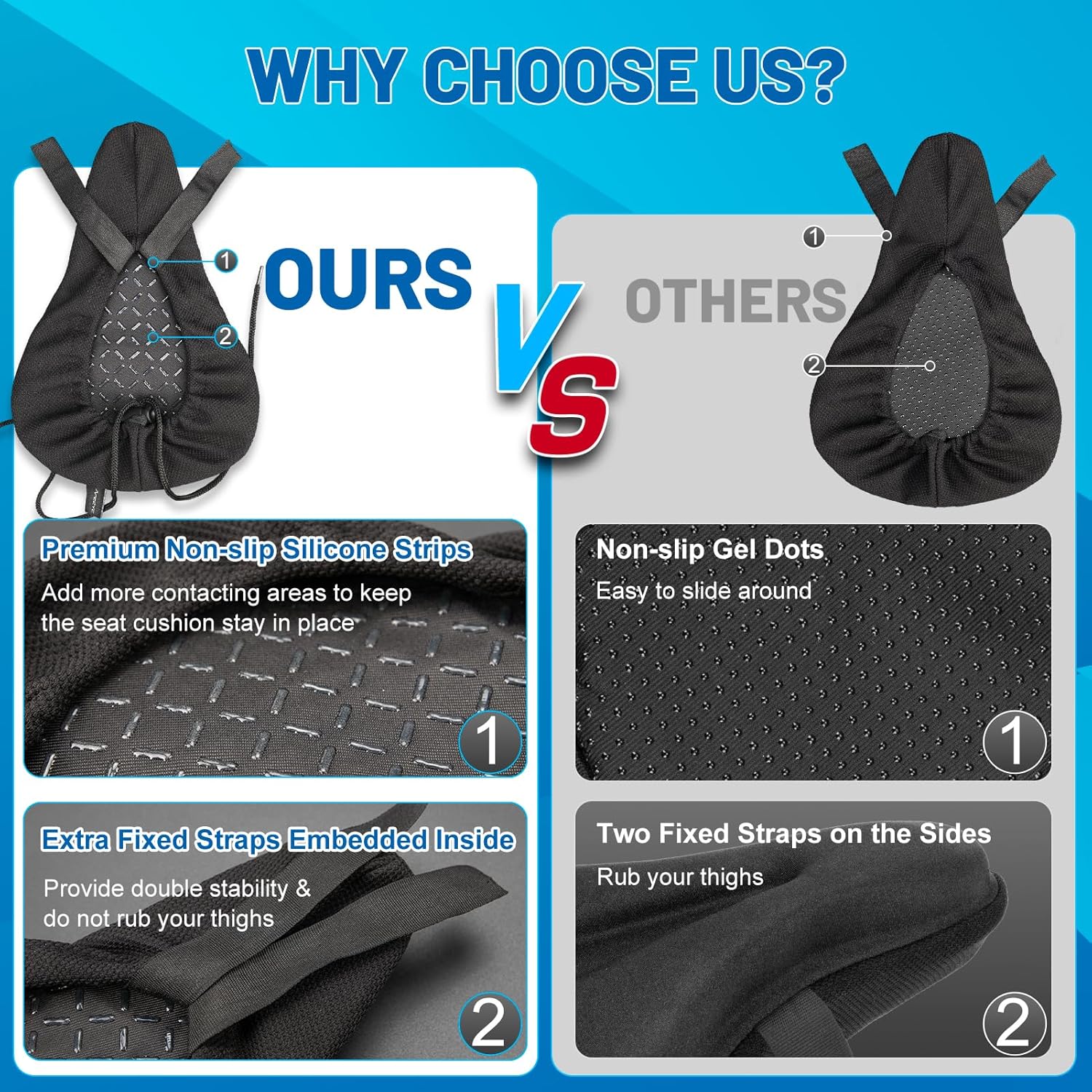 Stay in Place: Our bike seat cushion is equipped with the sturdy and premium anti-slip silicone strips that provides a secure grip and prevents any sliding or discomfort. Riders are no longer to worry about slipping and sliding off their bike seat