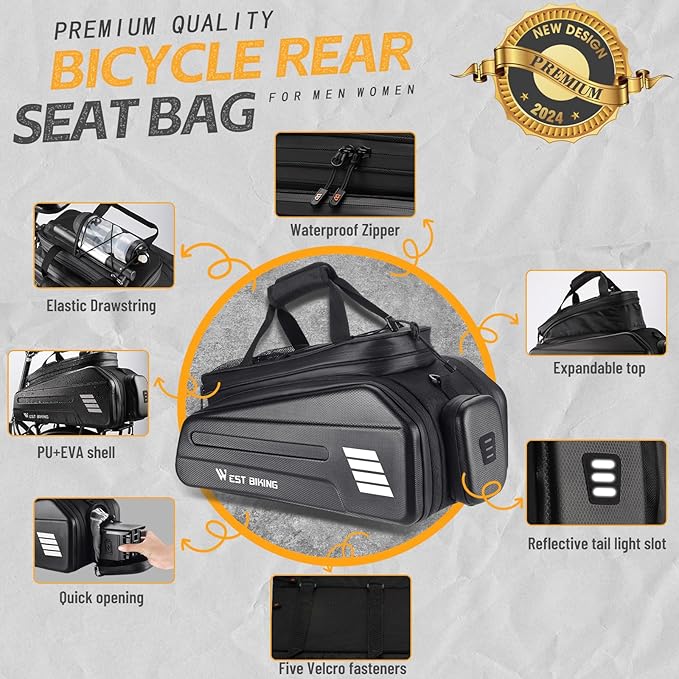 HIGH QUALITY WATERPROOF MATERIAL – The E bike rack bag is made of 600D Oxford fabric and coated with PU, the side shell is designed with EVA hard shell, which is waterproof, durable, lightweight and easy to clean. Waterproof material and fully waterproof dual zippers help keep your items dry, and there’s also a rain cover so you don’t have to worry about riding in the rain. (Note: The unfolded side bags are not waterproof and a rain cover is required)