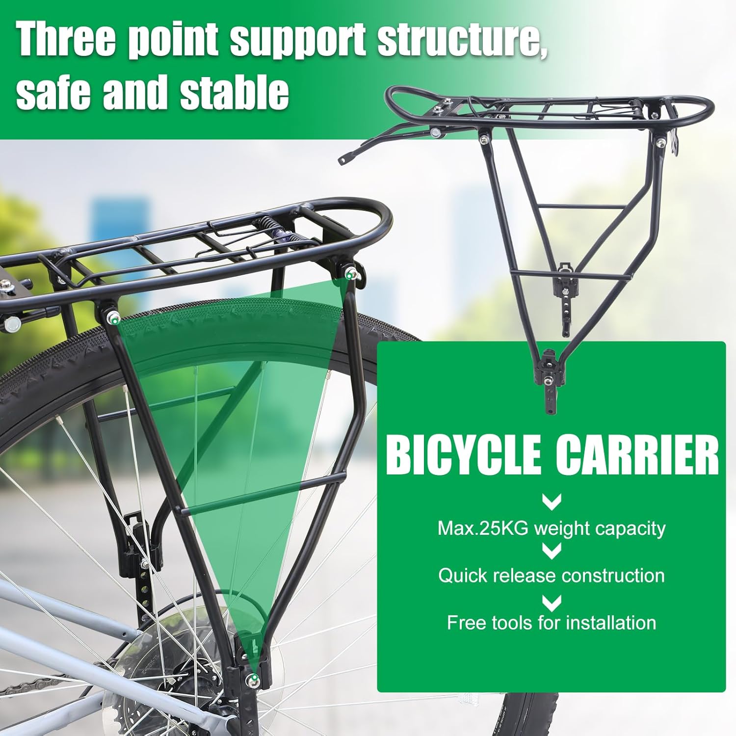 - 【Three Point Support Structure – Stable Security Architecture】Make sure bike cargo rack stable and safe.Max bearing weight: 25kg(55lbs).Size:L 15.2″ x W 4.5″.Height from the bottom holes: 13″-15.5″:2.5″ adjustable range makes it suitable for 24″ 26″ 28″ bikes/700C road bike/commuter bike/cruiser bike/mountain bike etc.