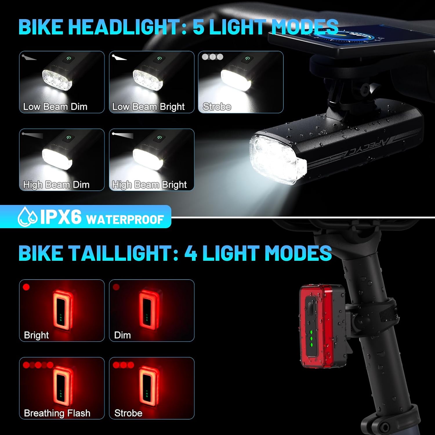 - 5+4 Lighting Modes with Memory Function: The bike headlight offers 5 modes (Low Beam Dim/Low Beam Bright/High Beam Dim/High Beam Bright/Strobe), and the tail light has 4 modes (Bright/Dim/Breathing Flash/Strobe), both remembering your last setting