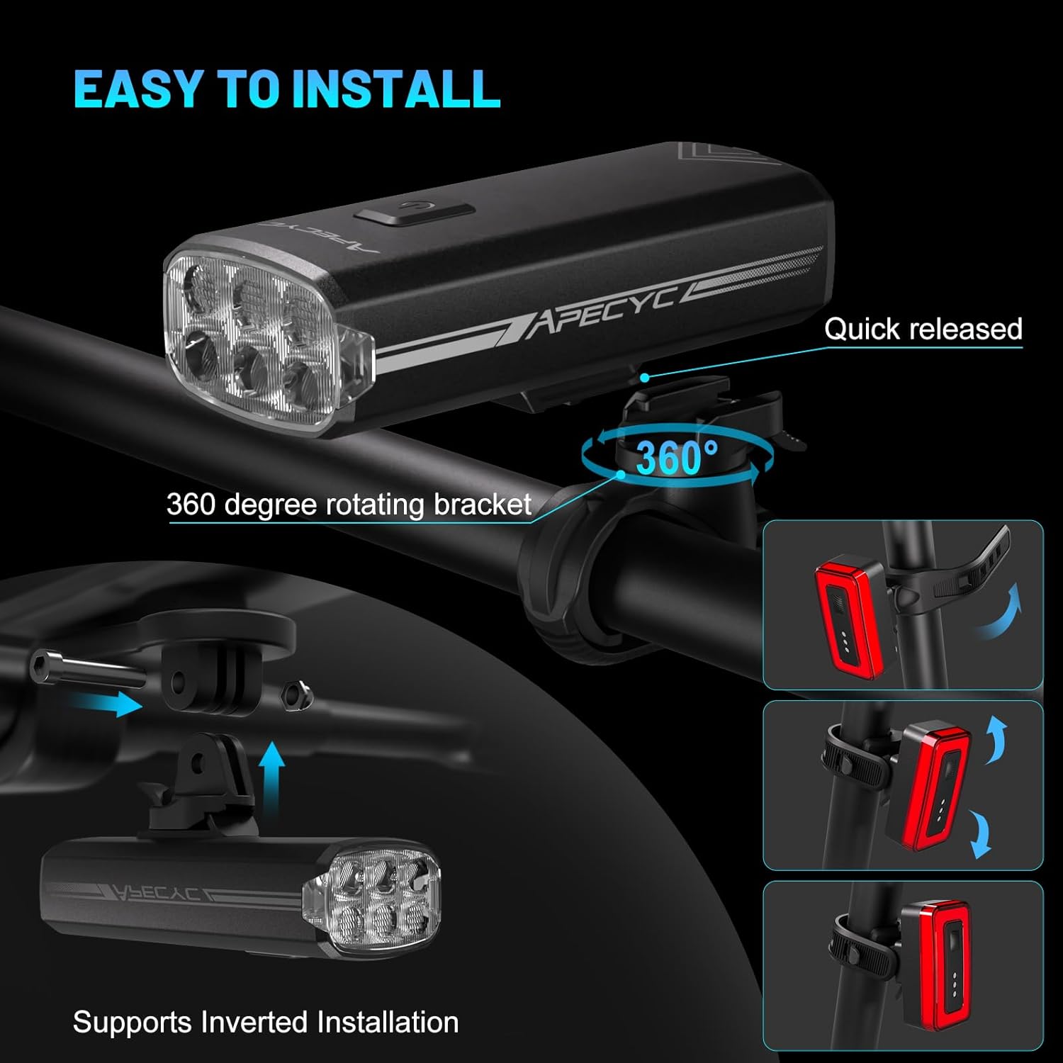 - Easy to Install: No tools needed, just snaps on in seconds with silicone straps or quick-release brackets. For reversed bracket mounting, secure the bracket beneath your handlebar first, then click the light onto it