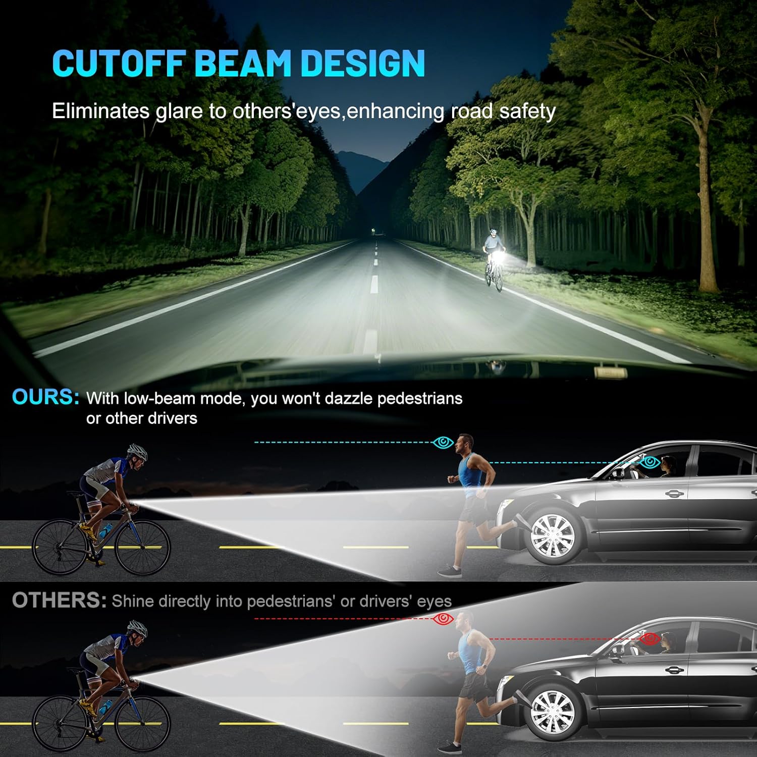 - Cutoff Beam Design: The glare-free design prevents glare, ensuring safe night riding without blinding pedestrians and drivers. Safe for oncoming traffic while lighting your path