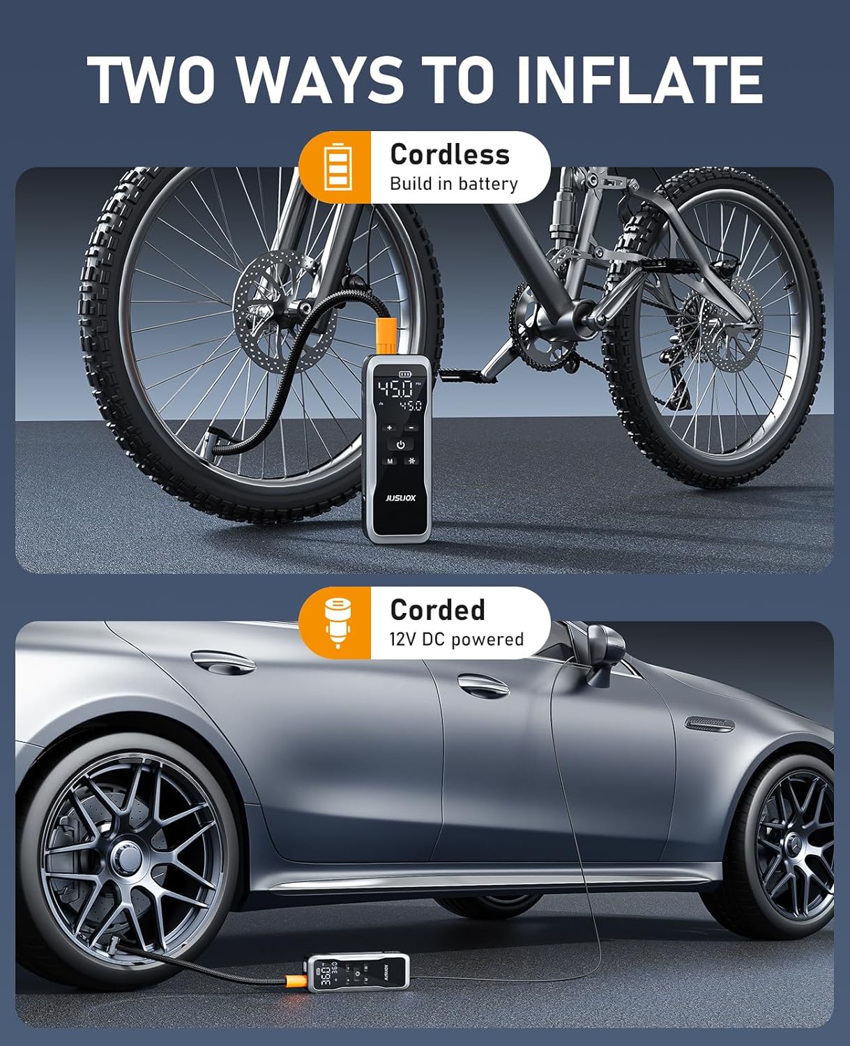 - 4+N Modes & Auto-Stop – Experience effortless inflation with our smart tire inflator, whether you’re pumping up bicycle tires for a weekend ride, motorcycle tires for a road trip, car tires for daily commutes, or sports balls for a backyard game, our inflator’s 4+N intelligent modes have you covered. Simply preset your desired pressure, it automatically stops when the preset pressure is reached, offering you a safe, quick and reliable using experience.