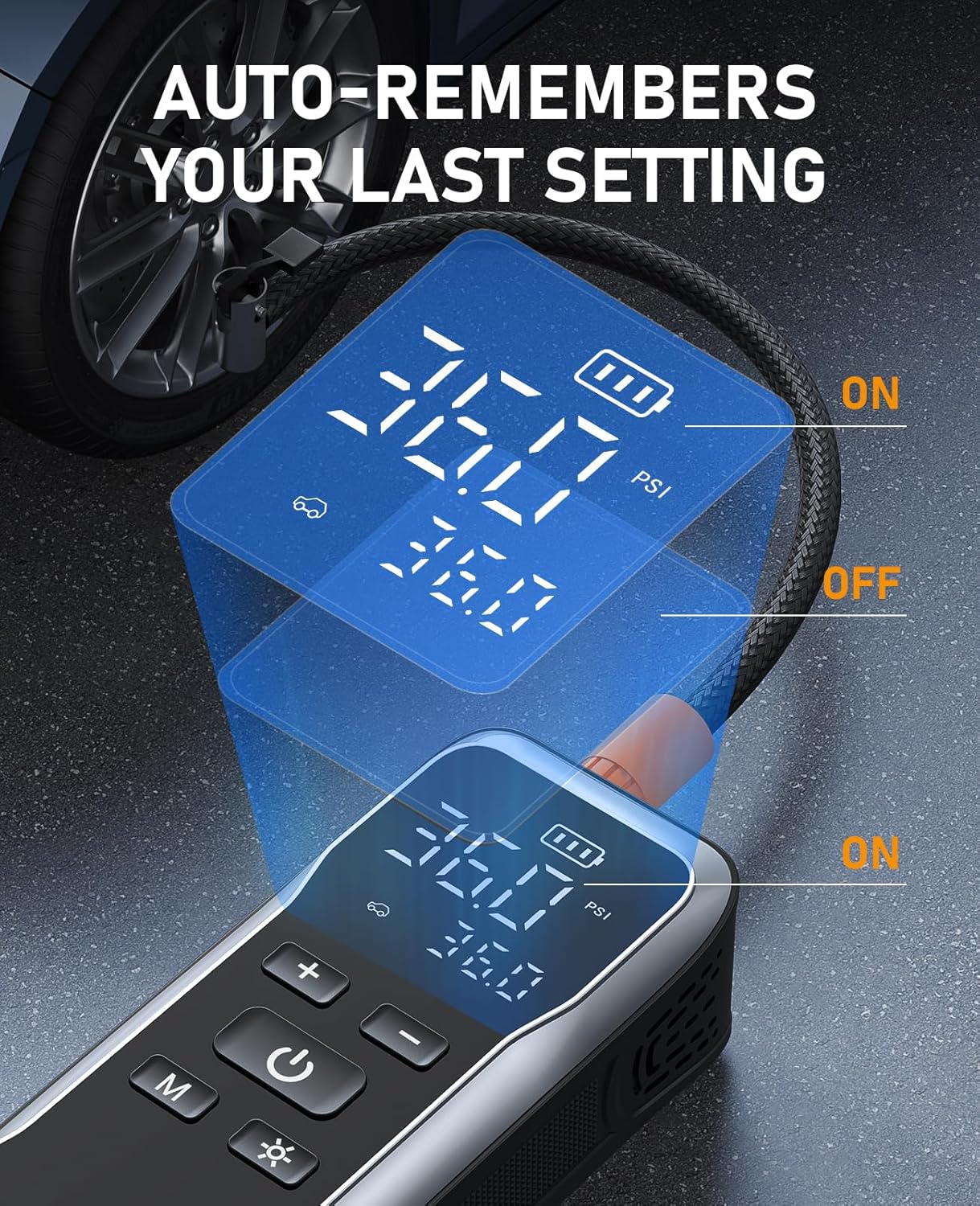 - Precision LCD Dual Screen – This portable air pump features a high-performance digital pressure gauge, instantly view real-time pressure values and your preset pressure on the dual LCD screens. Effortlessly switch between four units (psi, kpa, bar, and kg/cm²) for ultimate convenience. Achieve your perfect tire pressure every time with pinpoint precision—no more guesswork or over-inflation. Feel confident on every journey with our reliable, easy-to-use tire inflator.