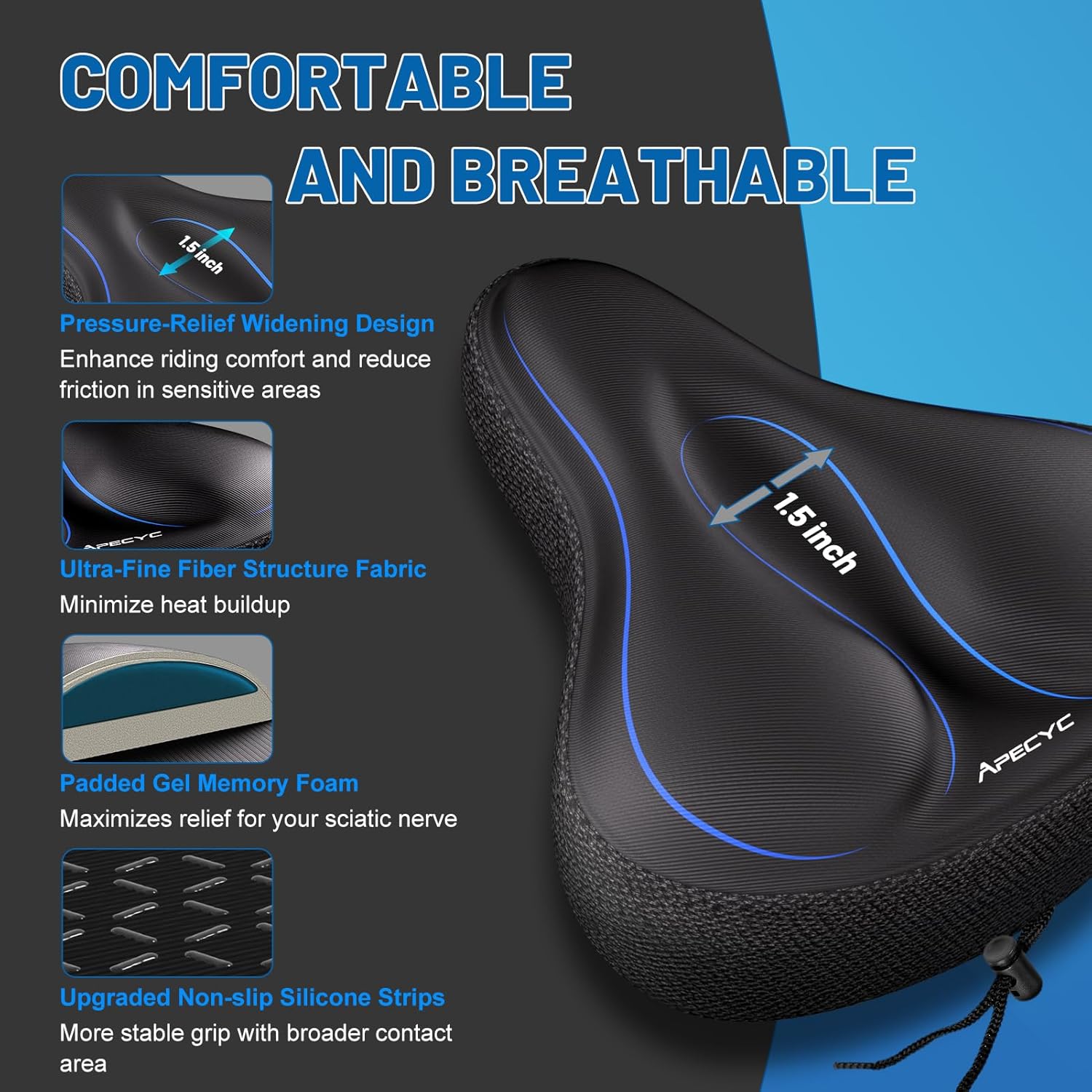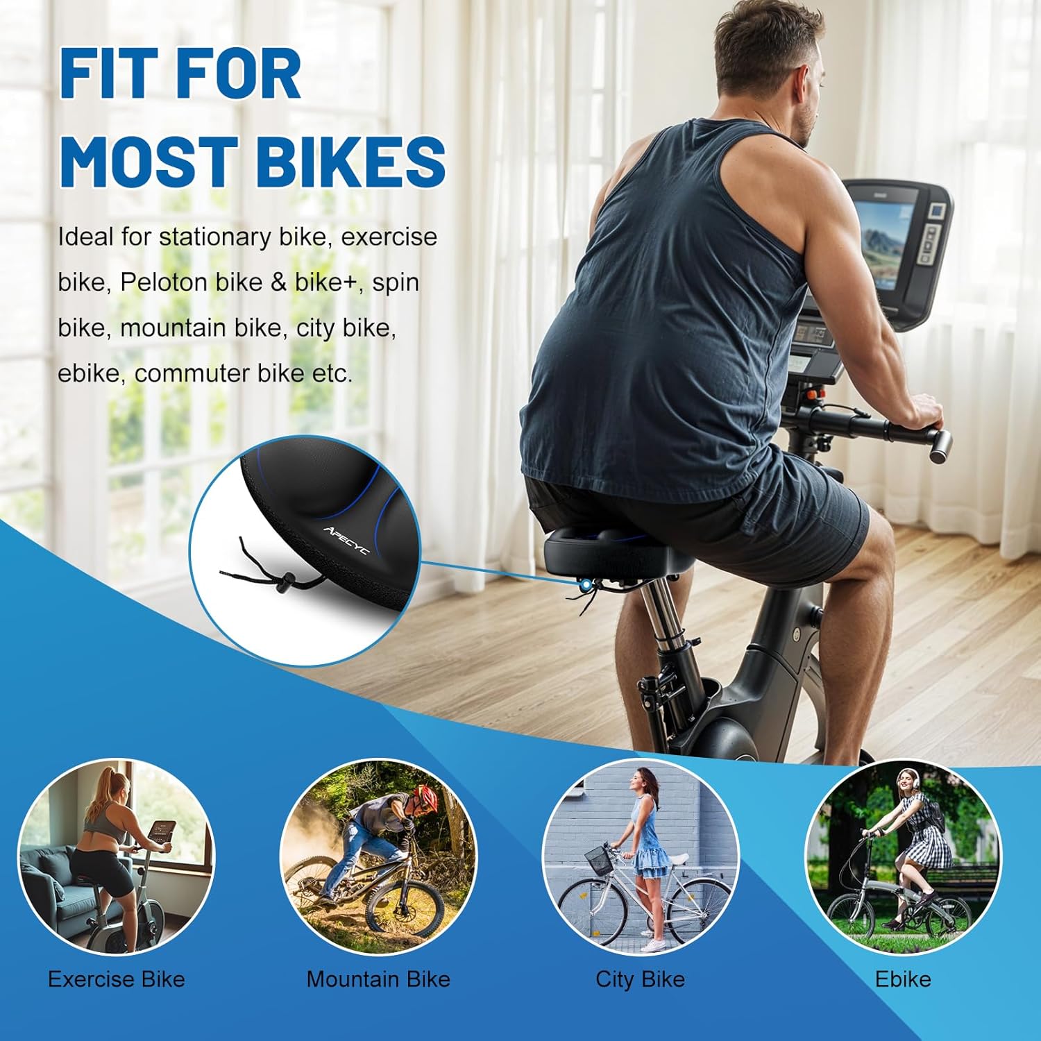 Pressure-relief Widening Design: Experience superior comfort with our extra-wide relief channel that prevents chafing in delicate zones. Oversized bicycle seat cushion fits most standard and wide bike seat, ensuring full coverage comfort during exercise. Compatible with bike seats 9.5 to 10 inches wide