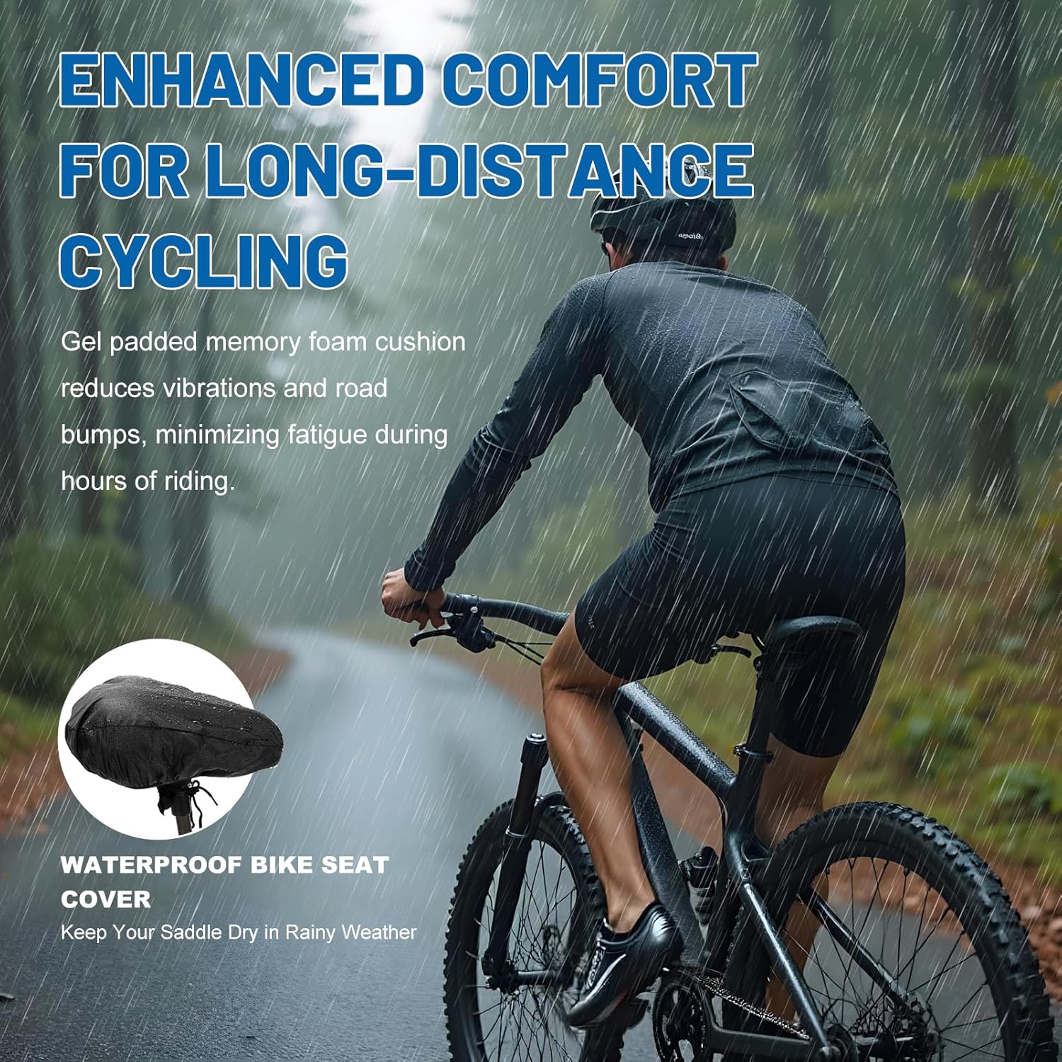Superior Comfort & Support: Upgraded with premium gel and memory foam layers, this bike saddle cushion reduces vibrations and discomfort on bumpy roads during hours of riding, relieving sit bone and groin pressure